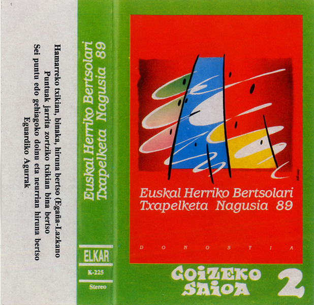 Euskal Herriko Bertsolari Txapelketa Nagusia 1986; Arratsaldeko Saioa 1 Arratsaldeko lana: 1- Ofiziotan binaka: launa bertso zortziko txikian 2- Ofiziotan binaka: hiruna bertso hamarreko nagusian 3- Kartzelako gaia: a) bukaera emanda bertso bat osatu b) gai bat emanda hiru bertso neurri eta doinu librean 4- Txapeldunaren bertsoa Oharra: Lau kasetetan bi saioak osorik sartzeko nahiko leku ez dagoenez, derrigorrezkoa gertatu zaigu bertsolari bakoitzari bertso bat edo beste kentzea. Bai goizeko eta bai arratsaldeko agurra. Goizeko saiotik puntua emanda eta lau oinak amanda osatu beharreko bertso bana kendu zaio bertsolari bakoitzari ( puntuaziorik txikiena lortuta bertsoak). Arratsaldeko saioari puntukako saioa jan zaio.