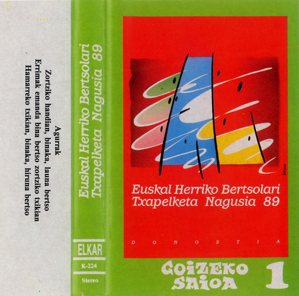 Lehen aldea: 1- Hamarreko txikian, binaka, hiruna bertso: Egaña eta Lazkano; 0' 00' 2- Puntual jarrita zortziko txikian bina bertso: Lopategi; 5´30' Mendizabal; 6' 53' Murua; 8' 17' Lizaso; 9' 39' Lazkano; 10' 56' Enbeita; 12' 14' Euskitze; 13' 31' Egaña; 14' 49' 3- Sei puntu edo gehiagoko doinu eta neurrian hiruna bertso: Lopategi; 16' 14' Mendizabal; 21' 27' Murua; 25' 34' Bigarren aldea: 1- Sei puntu edo gehiagoko doinu etsa neurrian hiruna bertso: Lizaso; 0' 00' Lazkano; 4' 01' Enbeita; 8' 19' Euskitze; 14' 07' Egaña; 18' 42' 2- Eguardiko agurrak; 23' 13' Oharra: Lau kasetetan bi saioak osorik sartzen ahalegindu bagara ere, leku arazoak direla, goizeko eta arratsaldeko hainbat agurreko bertso kanpo utzi beharrean gertatu gara.