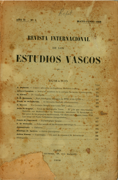 - Echegaray, Carmelo de. Wentworth Webster P. Yturbide. Le registre basque de la commune d'Ahetze C.C. Uhlenbeck. La Declinación ibérica G. Adéma. IV. Cantiques R. de Santa Maria. Algunos Jesuitas vascos desterrados Mugika'ko Gregorio. Gure Gauzak: Bertsolariak (fotograbados) Fermin Herrán. Sobre el Pais Vasco Pierre Lhande. L'Emigration basque (suite) F. Gascue. La situacion de la antigua Oiasso J. B. Daranatz. Les fonds Doat, Duchesne et Oïhenart a la Bibliothèque Nationale F. Gascue. Los trabajos mineros romanos de Arditurri (Oyarzun) Julien Vinson. Le Verbe Basque H. Gavel. Sur un Proverbe en deux Langues H. Gavel. Liçarrague ou Leiçarraga? Julien Vinson. Verbi Vasconici Edward S. Dodgson. La Synopsis de Monsieur Dogson