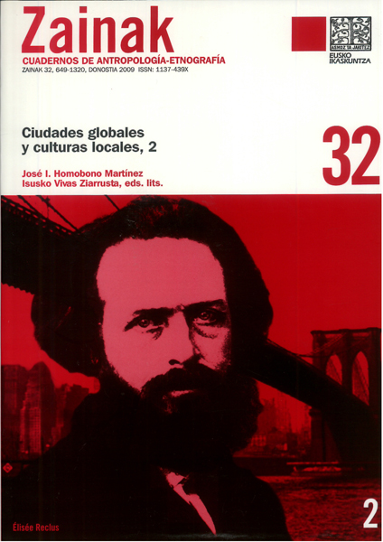 Sumario; pag.7 Homobono Martínez, José I.; Vivas Ziarrusta, Isusko; Ciudades globales y culturas locales. Aproximación a la temática de este monográfico; pag.13-71 I. Dossier: Élisée Reclus; las ciudades y su evolución Homobono Martínez, José I.; Las ciudades y su evolución. Análisis del fenómeno urbano en la obra de Élisée Reclus; pag. 75-116 Homobono Martínez, José I.; Evolución y renovación de las ciudades. Selección de textos de Élisée Reclus; pag. 117-211 II. El espacio público urbano: entre la sociabilidad y la producción de imágenes Agier, Michel; Incertitude urbaine et liminarité rituelle. Anthropologie des hors-lieux; pag. 215-232 Martínez Lorea, Ion; Nostalgias y autenticidades: la producción de imágenes del espacio público urbano; pag. 233-256 Iso Tinoco, Andoni; Los centros comerciales del área metropolitana de Pamplona. Imaginarios sociales, cambio y reestructuración; 257-273 Razkin Fraile, Mikel; Las huertas de Pamplona; con la azada en alto. Ocupación de espacios urbanos para un uso hortícola; pag. 275-290 Hernánadez Ramírez, Macarena; Piel sensible. Mercado y sociabilidad en el centro de Sevilla; pag. 291-304 Lekerikabeaskoa Gaztañaga, Amaia; Vivas Ziarrusta, Isusko; Tras las huellas de un paisaje cultural. Espacios 'anti-urbanos', territorio 'des-urbanizado' y ruina industrial: dobles miradas desde la escultura; pag. 305-326 III. Comunidad, movilidad y evolución: el 'cronotopos' de la ciudad Del Valle Murga, Teresa; Aproximación teórico-metodológica al estudio de la ciudad; pag. 329-346 Martínez López, Miguel; Reestructuración urbana en Pekín; pag. 347-390 Domínguez Pérez, Marta; Comunidad e identidad en la etapa de la globalización. El caso de un municipio de periferia metropolitana; pag. 391-416 IV. Territorios, paisajes e identidades: patrimonio cultural en la época de la globalización Silvano, Filomena P.; Cuando las ciudades se transforman en paisajes: representación, fragmentación e idealización del espacio urbano; pag. 419-429 Aranes Usandizaga, José I.; Landa Montenegro, Carmelo; Paz Camaño, Catarina; Sebastián García, Lorenzo; Aproximación al Casco Antiguo de Vitoria-Gasteiz como espacio para la cultura. Un ensayo de análisis hermenéutico; pag. 431-447 Díez Paton, Eva; El papel de los monumentos históricos-artísticos en la remodelación urbana de Bilbao (1876-1924); pag. 449-466 Rodríguez Becerra, Salvador; Hernánadez González, Salvador; Los conventos en la conformación de las ciudades medias andaluzas; pag. 467-501 Martín López, David; Visionando y restaurando la estética masónica en el paisaje urbano: el ejemplo de Canarias; pag. 503-525 V. Movimientos sociales y estrategias de dinamización-participación ciudadana Cucó Giner, Josepa; Los movimientos urbanos en la ciudad e Valencia: contexto y caracterización; pag. 529-549 Loiola Idiakez, Aitzol; Movimiento urbano juvenil herético-subversivo; pag. 551-565 Hernández García, Jone M. Tomar la palabra, tomar la ciudad. Reflexiones sobre ciudadanía y participación de las mujeres; pag. 567-584 García Jerez, Francisco A.; 'La Alameda que te gusta': conflictos sociales y planificación urbana en tomo a un espacio público; pag. 585-599 Ruiz Ballesteros, Esteban; Cantero Martín, Pedro A.; 'Yo, de mi puerta pa'entro'. Estrategias de dinamización sociocomunitaria en baariadas del Parque Público de Viviendas de Andalucía; pag. 601-619 Sabaté Muriel, Irene; Wir bleiben Allen. Okupación y condiciones de acceso a la vivienda en el barrio berlinés de Friedrichshain; pag. 621-633 Freán Hernández, Óscar; El anarquismo en la ciudad de A Coruña: un ensayo de contrasociedad; pag. 635-648