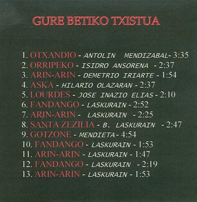 1- Pili. J.I.Elias. 2' 09'' 2 - Kaskagorria. 2' 42'' 3 - Errexea. P.Olazaran de Estella, Porrusalda. 2' 39'' 4 - Goizeko Izarra. Biribilketa. 3' 24'' 5 - Zarautz Maitea. 2' 56'' 6 - Erorda. Fandangoa. 2' 25'' 7 - Arin Arin. 1' 50'' 8 - San Sebastian Eguneko Diana. Biribilketa. 1' 55'' 9 - Ninueto. Monzon. 2' 50'' 10 - Ostian Bizi Zara. 2' 29'' 11 - Dira Dira Zezenak Dira. 3' 06'' 12 - Txistulari bakartia. 1' 44''