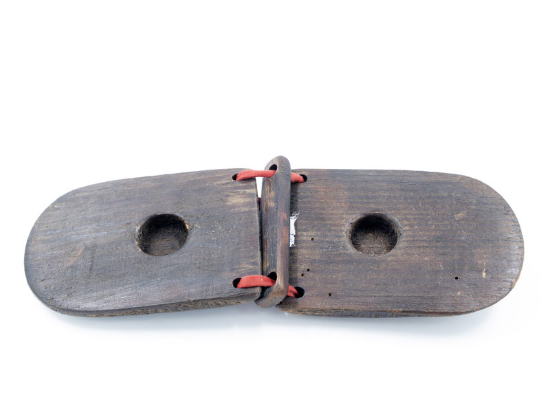 Ibizako castañuela parea da. Bi tabalatxo sasi lauki dira. Zinta gorri batekin loturik daude eta bien artean, bi zuloetatik zintarekin lotua ere, beste tablatxo estu bat dauka.
