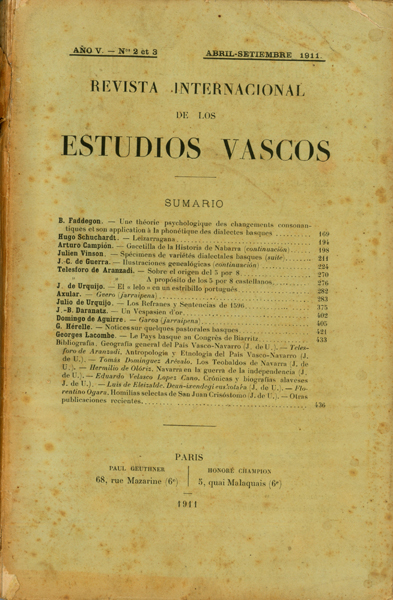 Echegaray, Carmelo de. Dn. Valentin de Olano Comtepse de Charencey. Etymologies euskariennes J.-B. Daranatz. Eskuara Axular. Guero Julio de Urquijo. La Tercera Celestina y el Canto de Lelo Martin Landerreche. Un équivalent du proverbe Urrungo eltzea urrez, Guharat orduko lurrez Fernando Mª Soloeta. Añibarro traductor del Guero M. Landerreche. Euskalzaleen Biltzarra; 1910eko Bilaldia Martin Landerreche. Euskarari nola Iraupen eman