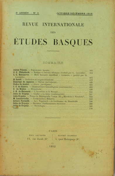 Schuchardt, Hugo. Zur methodischen Esforschung der Sprachverwandtschaft (Nubisch und Baskisch) Hugo Schuchardt. Bask, i-, e- Hugo Schuchardt. Ganzua Hugo Schuchardt. Span, zanahoria Hugo Schuchardt. 'La Couvade chez les Basques' Paul Labrouche. L'emploi du basque dans les actes labourdins Julio de Urquijo. Axular y su libro G. Hérelle. Notices sur quelques pastorales basques Arturo Campión. Gacetilla de la Historia de Nabarra Julio de Urquijo. La forma verbal deustat Pedro de Axular. Guero Juan Carlos Guerra. Ilustraciones genealógicas
