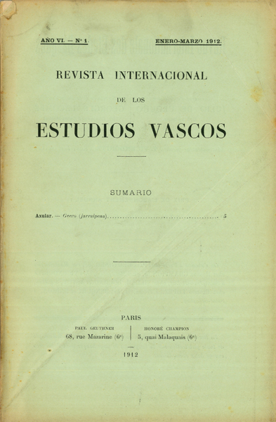 - Schuchardt, Hugo. Dechepareana Hugo Schuchardt. Zu den Sprichwörten Oihenarts Hugo Schuchardt. Gauntza, zauntza, dauntza Hugo Schuchardt. Leizarragana II Albert Léon. Quelques réflexions sur le verbe simple dans la conjugaison basque Arturo Campión. Gacetilla de la Historia de Nabarra J.B. Daranatz. Edouard Ducéré Henry Gavel. A propos du chant du prologue dans les Pastorales Basques Julio de Urquijo. Axular y su libro J. B. Daranatz. Henri IV et Axular Julio de Urquijo. Les études basques: leur passé, leur état présent, leur avenir Julio de Urquijo. Los Refranes y Sentencias de 1596 Martin Landerreche. Euskalzaleen Bilzarra J. B. Althabe. Euskal-hitz garbi X. Gipuzkoatik; Aurtengo Euskal-jaiak Julien Vinson. Le Congrès de Biarritz-Bayonne