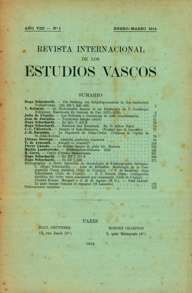 Saroïhandy, J. Vestiges de Phonétique Ibérienne en territoire roman Francisco Gáscue. Orígen de la música popular vascongada (fin) J. B. Daranatz. Le bayonnais Pierre Haudadine surnommé le Régulus nantais ( 1756-1846) Edward S. Dodgson. Rafael Micoleta: Not Nicoleta Camilo Villabaso. El Doctor Rafael Micoleta Fidel Fita. Rafael de Micoleta Rodolphe Goutman. Essai d'un petit vocabulaire basque-ougro-finnois Julio de Urquijo. De Linguística y Etnografía Vascas; A propósito del viaje del Dr. Rodolfo Trebitsch Paul Graziani. Le Musée de la Tradition Basque et Bayonnaise Telesforo de Aranzadi. De los nombres de los arces ó moscones en el País Vasco y su masculinidad Christian d'Elbée. Un dimanche au Pays Basque. Rectification. Table