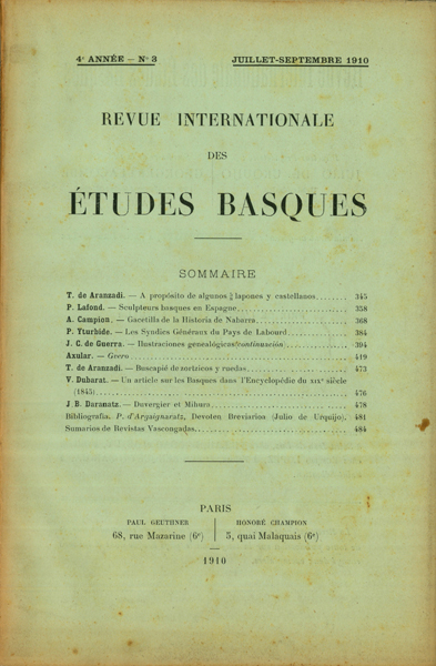 - Decrept, Etienne. Lettre sur le Théâtre Basque Etienne Decrept. Maitena V. Dubarat. J.-B. Daranatz. Sylvain Pouvreau valet de l'abbé de S. Cyran, protégé de S. Vincent de Paul Telesforo de Aranzadi. Del calendario vasco y del cuento de los dos jibosos A. D'Oihenart. Notes pour le vocabulaire de Pouvreau Julio de Urquijo. Cartas escritas por el príncipe L.-L. Bonaparta á algunos de sus colaboradores Domingo de Aguirre. Garoa (jarraipena) Rodolphe Goutman. Lelo X. Kasiño Donostian J.-B. Daranatz. Le Liçarrague du Chanoine Arbelbide Hugo Schuchardt. Iberische Deklination Uchin de Mendaur. Un bautizo