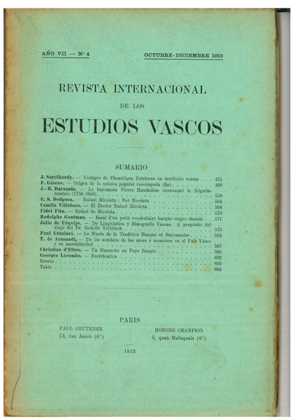 - Schuchardt, Hugo. Baskisch-hamitische Wortvergleichungen Arturo Campión. Gacetilla de la Historia de Nabarra ( continuación) Jean de Jaurgain. Toponymie basque (suite) Telesforo de Aranzadi. De craniometría de Guipúzcoa Joaquín Azpiazu. Un libro curioso Albert Léon. La manière actuelle d'indiquer les personnes-sujets au présent intransitif est-elle primitive en basque? Julio de Urquijo. Los Refranes y Sentencias de 1596 (continación) J.-B. Daranatz. Vieilles trouvailles V. Dubarat. Lettre sur l'abbé Darrigol, auteur basque (1829)
